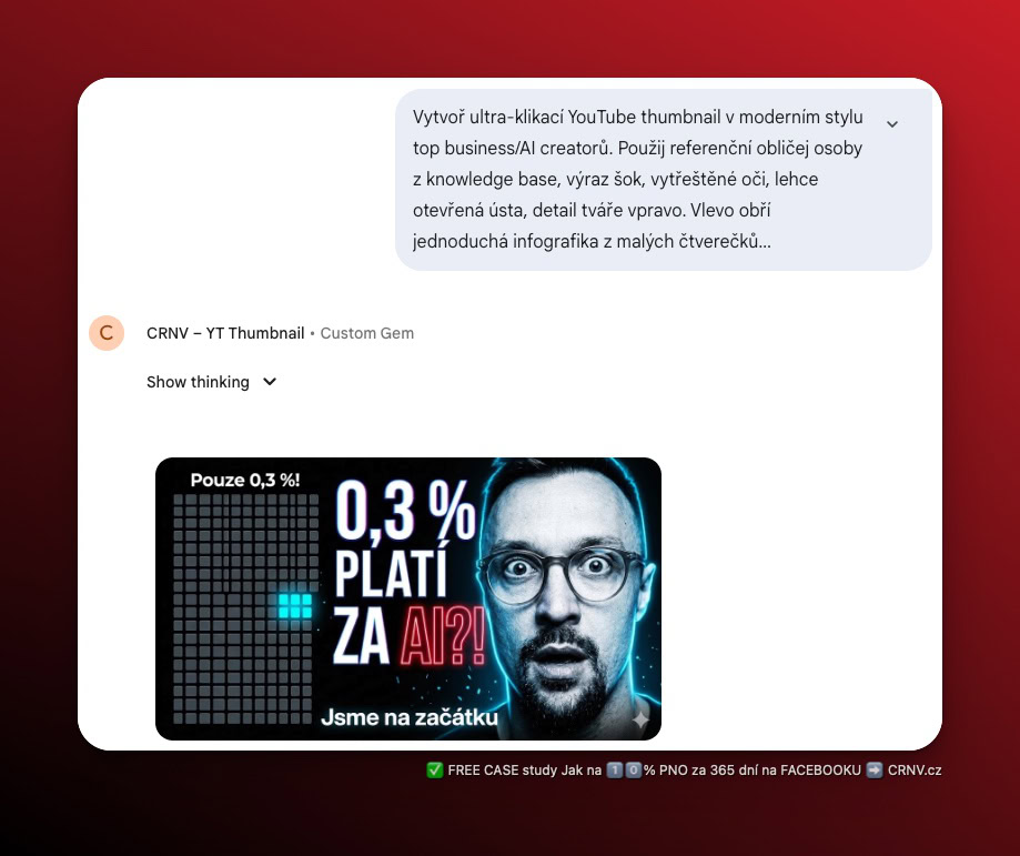 Vytvoříte si specializovaný Gem (např. „YouTube Thumbnail Creator“), do kterého už nahrajete svůj obličej jako referenční fotku a dáte mu základní pravidla hry: „Jsi expert na tvorbu proklikových náhledovek. Používej kontrastní barvy, vždy zahrň referenční obličej a udržuj čistý, nechaotický vizuální styl.“
